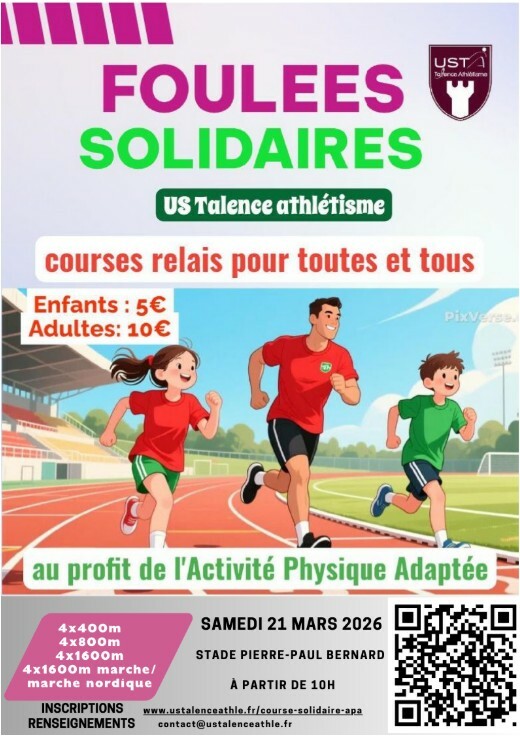 Les fonds collectés seront intégralement reversés à la section Activité Physique Adaptée (APA) de l’U.S. Talence Athlétisme, qui accompagne chaque année près de 100 personnes atteintes d’affections longue durée (cancer, maladie cardio-vasculaires, diabète, etc…).